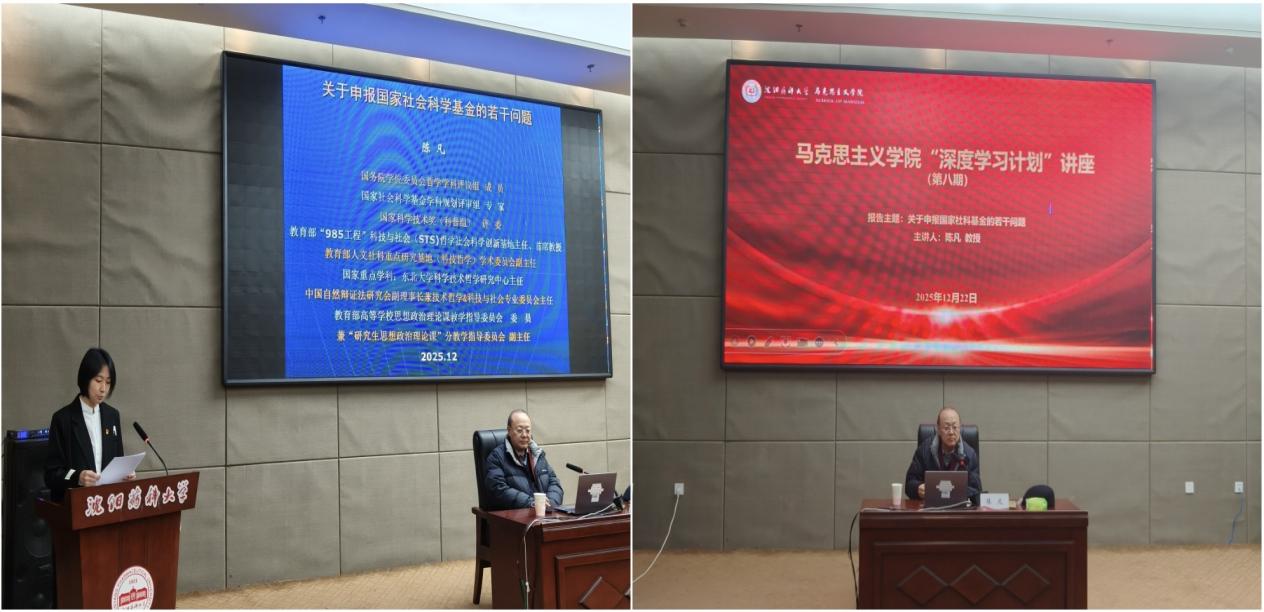 为精准破解教师在国家社科基金申报中的重点难点问题,持续夯实学院科研发展基础,全面提升教师课题申报能力与学术研究水平,12月22日下午,马克思主义学院举办第八期“深度学习计划”,特邀东北大学陈凡教授作“关于申报国家社科基金的若干问题”专题讲座,全体教师参会学习,报告会由学院副院长宋雪主持。